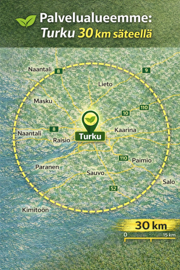 Palvelemme Turusta 30 km säteellä – nopeasti ja joustavasti. Alueeseemme kuuluvat mm. seuraavat paikkakunnat: